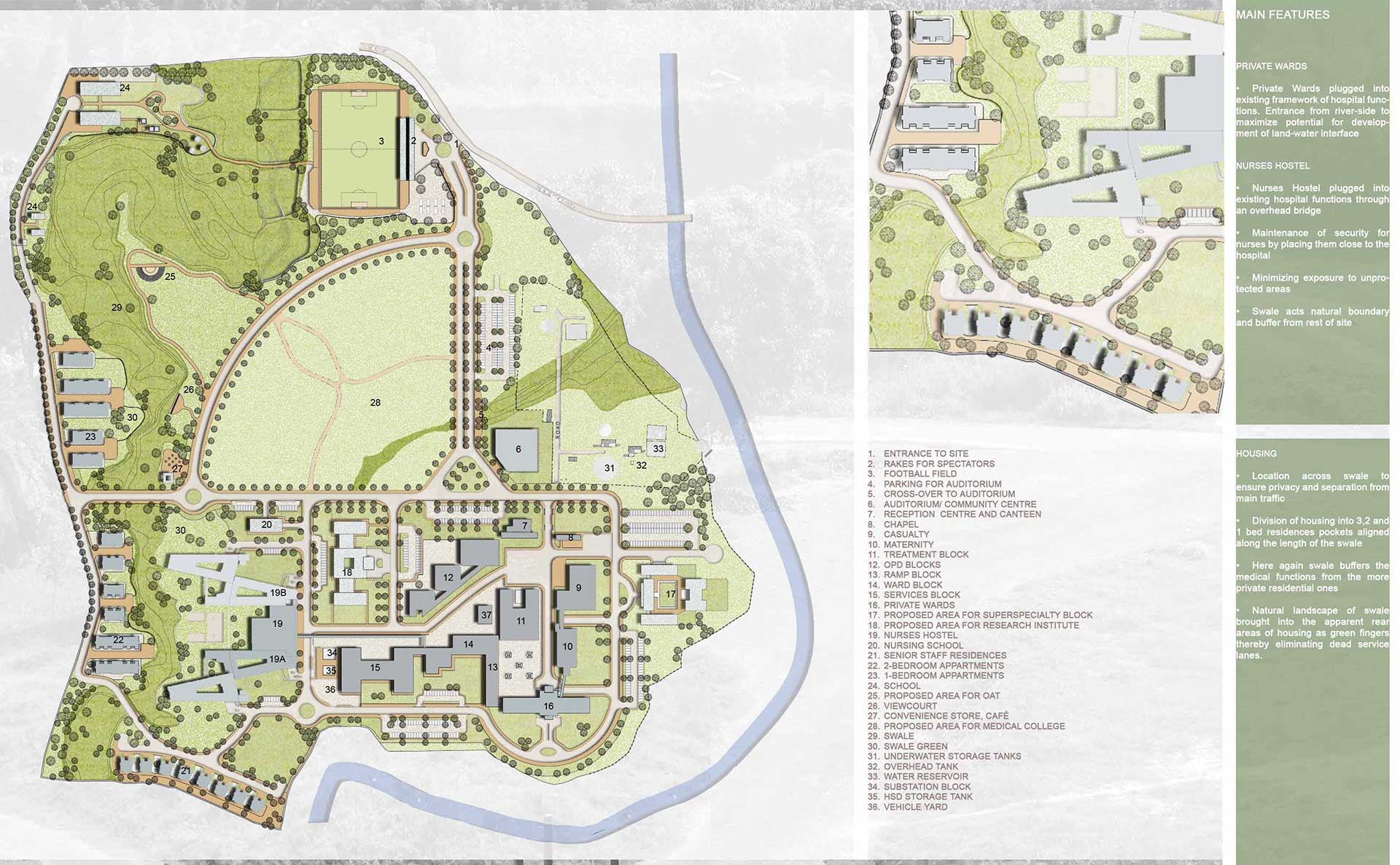 The commission was to develop an integrated master plan for a 100 acre campus for the Christian Institute for Health Sciences & Research keeping in view some existing facilities. The new proposal along was to plan and design for staff and nurses' residences, dining halls and private wards. Bargad's significant achievement was to declare 30 acres of wetlands a no build zone, thus preserving and creating a natural feature buffer zone between the Academic/Hospital on one side and the Residential on the other.